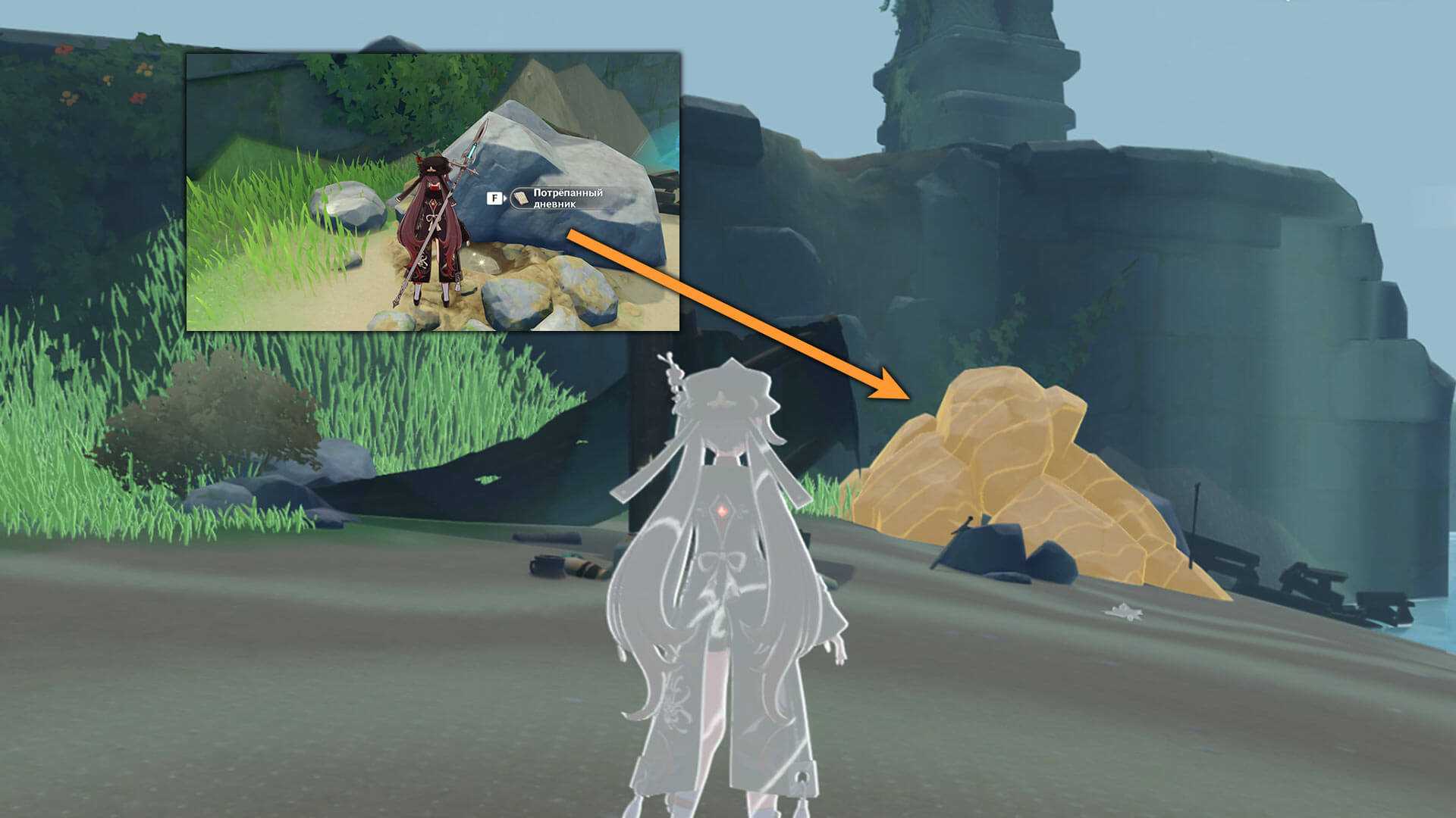 После начала задания направляйтесь на южную сторону острова, недалеко от того места, где находился Страж руин, и вы увидите лопату, воткнутую в песок. Уничтожьте кучу камней возле нее и прочтите Потрепанный дневник, валявшийся внизу.