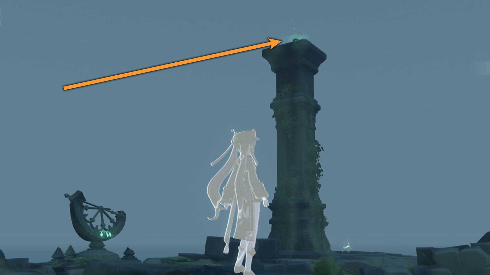 Измените игровое время на 2 часа ночи и используйте Зрение стихии (колесико мышки) на солнечных часах. Это позволит вам увидеть скопление Анемо. Используйте на нем навык ветра, чтобы рассеять его. Найдите другие скопления. Их можно отыскать на юго-западе, востоке и на вершине самой высокой колонны острова (смотрите изображения ниже).