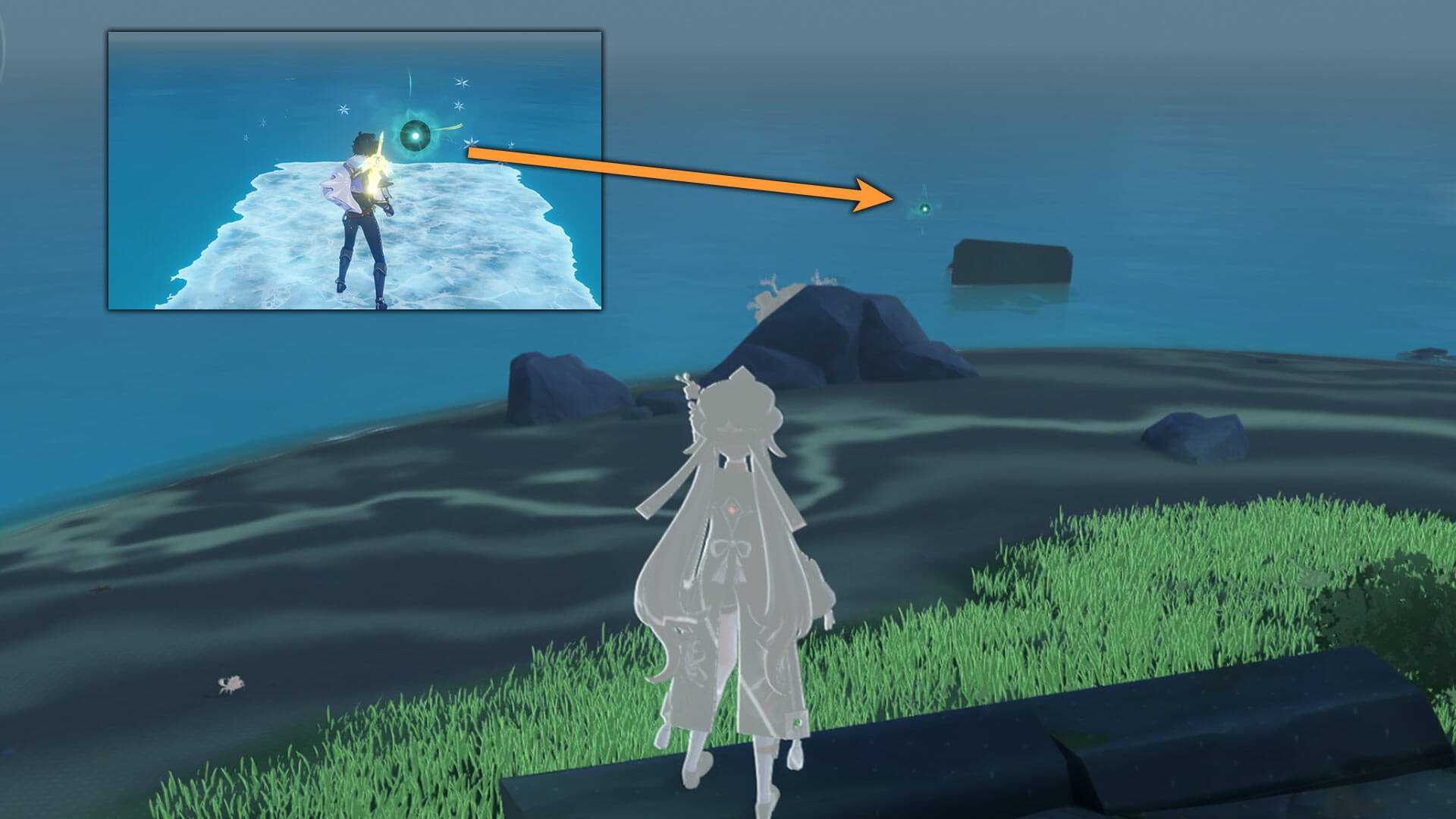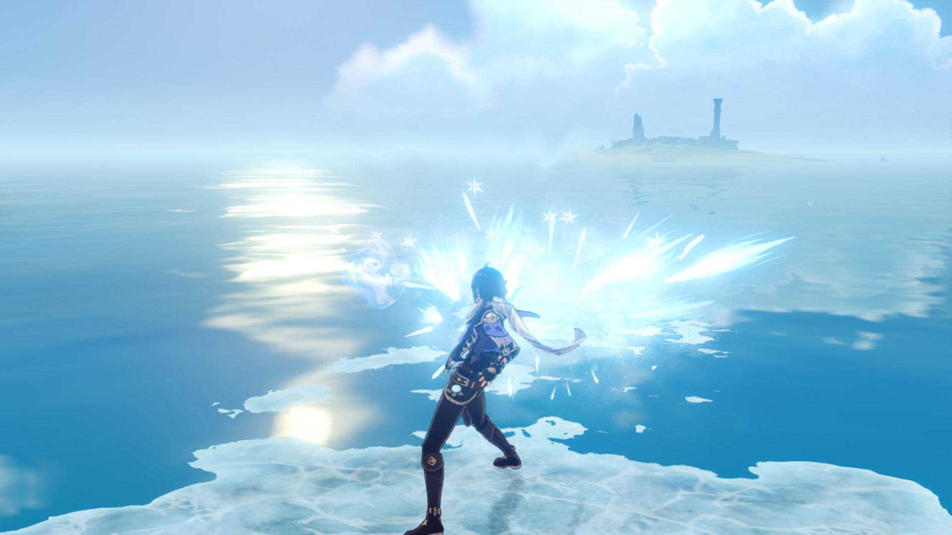 Второй способ более долгий, но использовать его могут все. Берем в отряд Кэйю и замораживаем его умением перед собой воду в сторону острова. И так потихоньку продвигаемся к необитаемому острову.