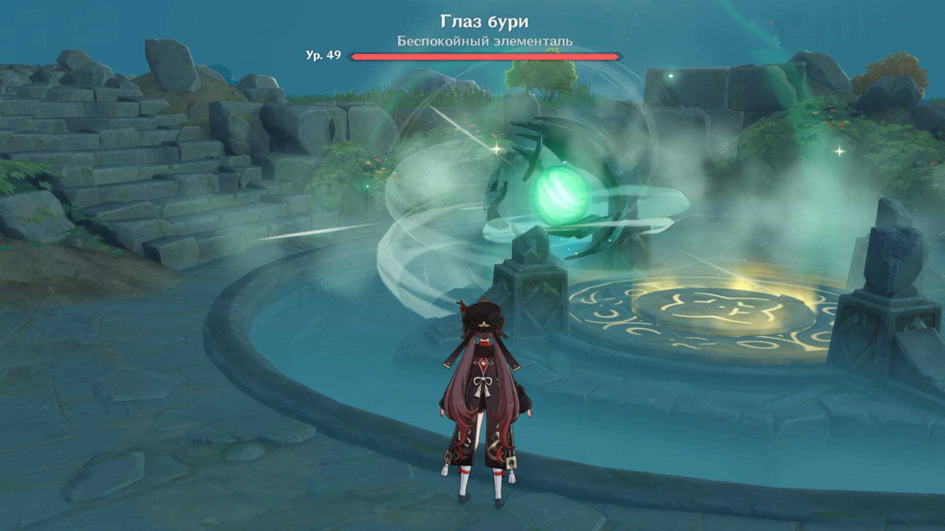 Используем на него Анемо умение и появляется Глаз бури. Во время битвы будут периодически появляться Анемо слаймы и Анемо шамачурлы.