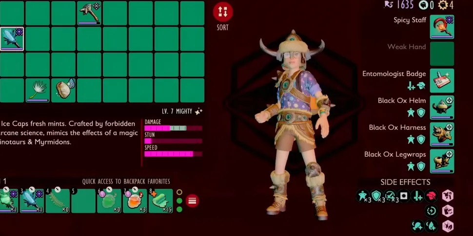 Ox Wizard использует все три посоха и переключается между ними, а также оснащен аксессуаром «Значок энтомолога», который дает бонус к наносимому урону. Ox Wizard, что, возможно, неудивительно, одет в Black Ox Armor с головы до ног, а мутации, Meat Shield и Spicy Safety повышают живучесть, в то время как Cardio Fan и Buff Lungs увеличивают выносливость. Наконец, Whittle Wizard необходим для этой сборки, так как он увеличивает силу всех посохов.