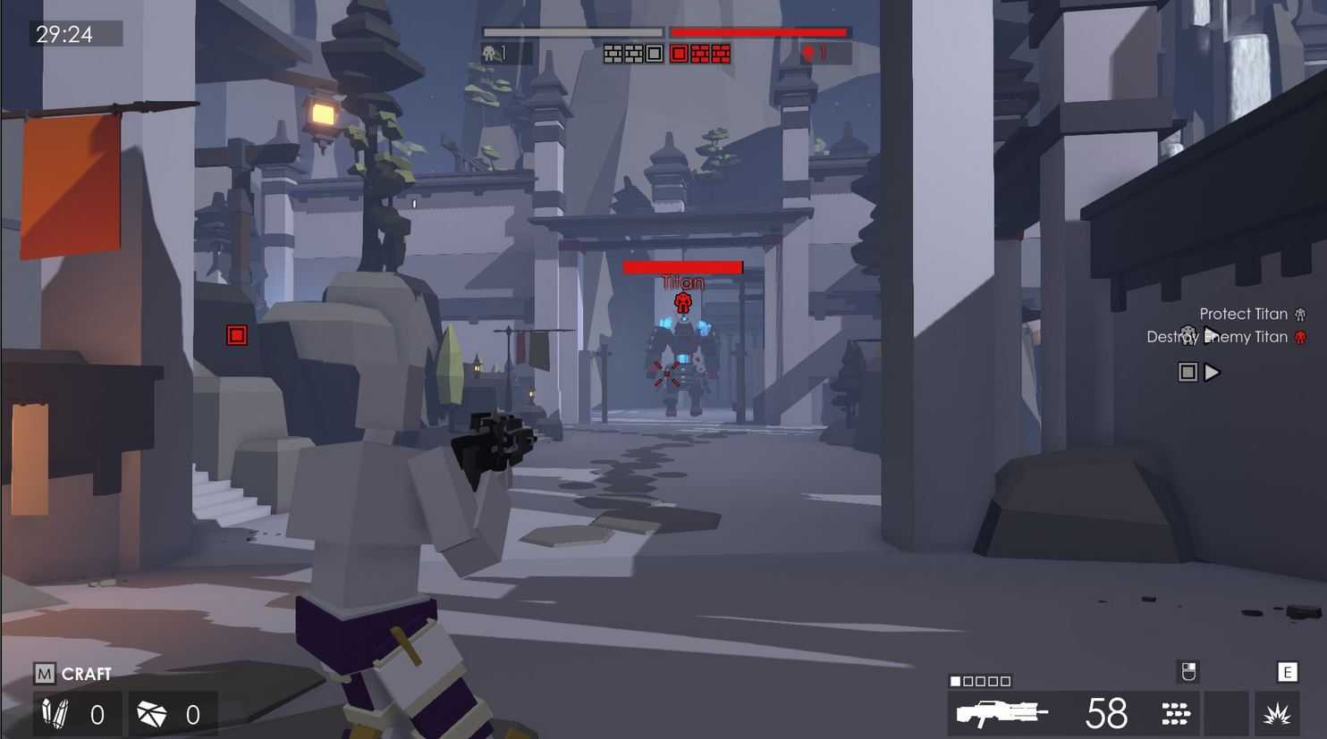 После ознакомления с управлением, режимами и окружением, игроков знакомят с лобби, где раскрывают скудный интерфейс, стилизированный под общий минимализм. Но интерфейс не вызывает отторжения, а только заставляет отыскать в скудных буквах и кнопках что-нибудь стоящее и интересное. Заботливые стрелки указывают, что у игрока есть шесть пресетов оружия, куда можно положить два инструмента для убийства и вспомогательный девайс: гранату, пулемет, телепортер, таблетку ускоренного бега и другие необычные игрушки. Во внутриигровом магазине солдату раскрывают весь доступный арсенал. Но прежде чем взять в руки очередной огнестрел, плазмаган, или холодное оружие, нужно раскрыть его чертеж и создать из запчастей, полученных в перестрелках. В оружие предусмотрен дополнительный режим, призванный на мгновение усилить атаку персонажа. Снайпер обзаводиться прицелом, мечник делает стремительный рывок, а штурмовик проводит несколько очень быстрых выстрелов.