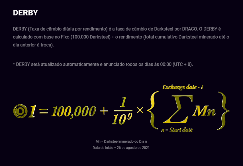 DERBY (Daily Exchange Rate By Yield) – обменный курс Darksteel на DRACO. DERBY рассчитывается на основе фиксированного (100000 Darksteel) + доходности (общая совокупная добыча Darksteel за день до обмена).