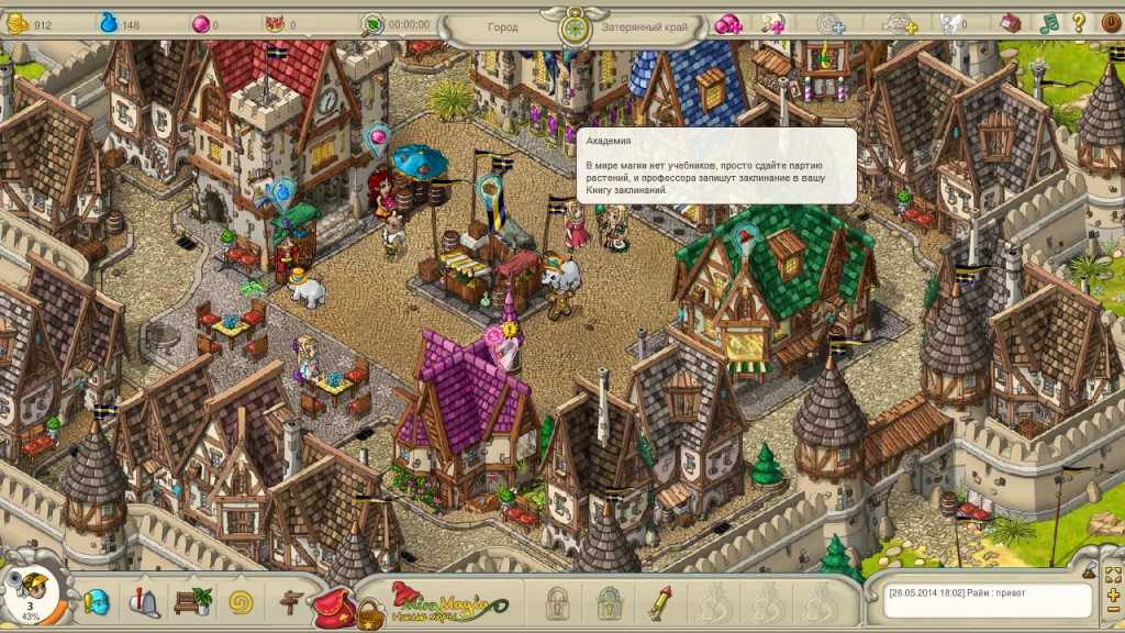 Город заслуживает отдельного внимания. В нем находятся уникальные в Мирамагии заведения, поэтому сюда периодически стекаются жители всех поселений. Так, в Ратуше вы сможете узнать, какое место занимаете в общем рейтинге игроков, в Волшебной лавке сможете купить новые культуры, декорации, ограждения, корм питомцу, а также всякие атрибуты для своего героя. Чтобы изучить новые заклинания или повысить эффективность уже имеющихся, зайдите в Академию. Все желающие прикупить себе одежки могут сделать это в салоне «У Эммы».
