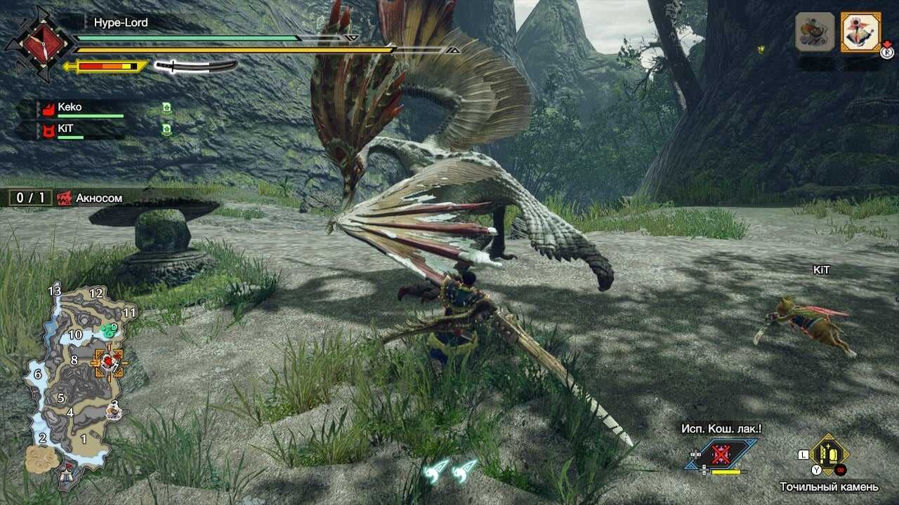 Вообще Rise довольно толково представляет каждую внутриигровую функцию, описывая ее суть – загвоздка в подаче. Мне, впервые запустившему Monster Hunter, очень тяжело запомнить все эти механики и тем более уловить их взаимосвязь (она, конечно, есть), а именно этого игра пытается добиться. Ощущения такие, будто со мной толком не поздоровались, но уже всучили гору учебников по разным предметам, ожидая, что я сразу в них сориентируюсь. Резон у неуклюжего подхода есть, но прежде чем его объяснить, перейду к главному – охоте.