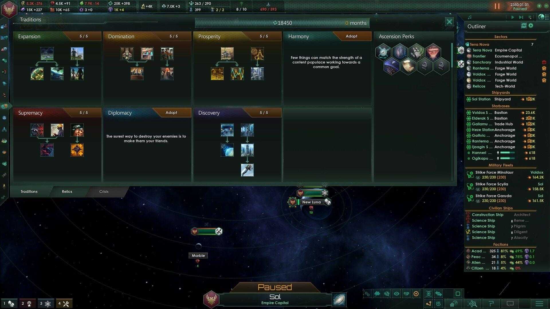Поскольку в рамках данного билда не будет строиться максимальное количество городских районов, потребуется дополнительное жильё и дополнительное производство на рабочих местах (особенно нужно для клерков) от Процветания. Превосходство пригодится в конце игры, чтобы сделать флоты более мощными.