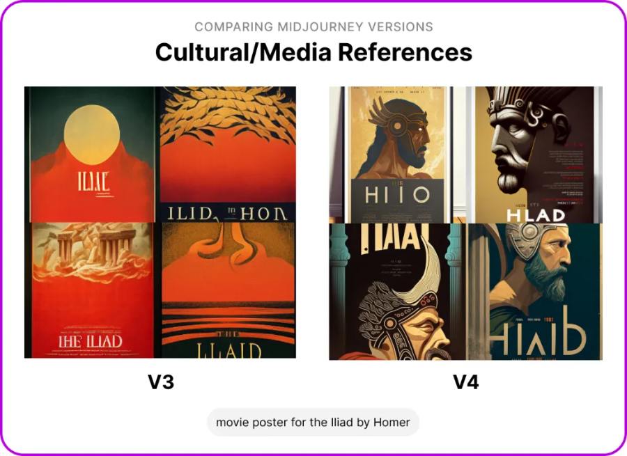Midjourney V4 отлично справляется с распознаванием отсылок на практически… любые произведения искусства. На примере выше видно, что Midjourney V3 была обучена на существующих обложках книги «Илиада», но похоже, что Midjourney V4 действительно знает содержание книги.