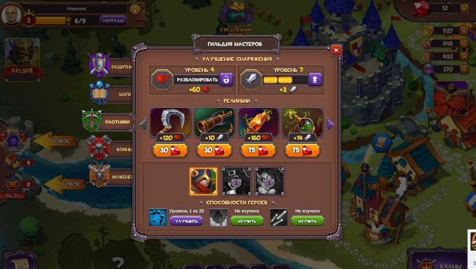 Также у нас есть герои, которых мы сможем брать в бои. У каждого героя есть свой домик, но есть общее здание под названием гильдии мастеров, где можно посмотреть, кто у нас есть. Герои делятся на 5 типов — защитники, маги, охотники, воины и инженеры. В каждом классе есть несколько героев, но можно для них всех улучшить общие характеристики. Плюс к этому можно изучать два типа навыков — один навык индивидуальный и одиночный для каждого героя, и три навыка можно постепенно улучшать.