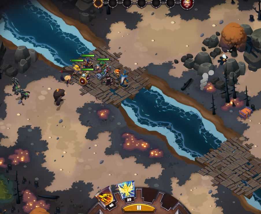 То есть у нас есть город, который нам надо развивать как в обычной стратегии, отстраивать домики, производить ресурсы, добывать монетки, зелья, пшеницу, крафтить разные штуки типа заклинаний, развиваться и потом уже ходить в бои против орд противников несколькими героями.
