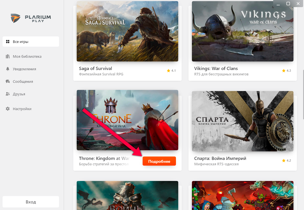По завершении Plarium Play автоматически откроется. Вы можете посетить вкладку «Все игры» и загрузить любой их предложенных проектов, которые были выпущены студией Плариум. Для этого наведите курсор на нужную игру и кликните по кнопке «Подробнее».
