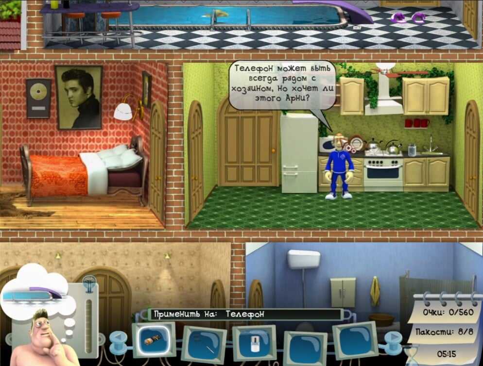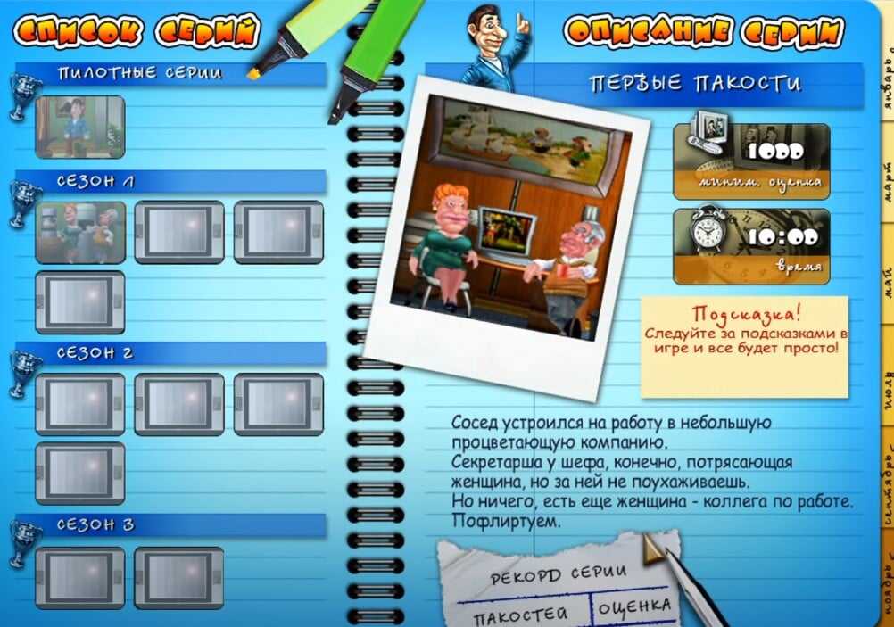 Отличная возможность пройти все сезоны любимой игры на компьютере. В выходной день всегда хочется выспаться, но за стеной раздаются громкие звуки от соседа. Начало дня испорчено, настроение пропадает моментально, хочется отомстить дурному соседу, который не даёт покоя. Именно эта тема стала центральной в знаменитой аркаде, которую теперь обожают тысячи людей по всему миру. Разработчики открыли возможность свершить долгожданную месть в виртуальном режиме, где не будет ограничений. Нашли прекрасный способ насолить гадкому соседу? – Замечательно, начинаем исполнять свой коварный план. Через несколько секунд можно будет наслаждаться выполненной проделкой, и получать несказанное удовольствие. Многие задаются вопросом: «Сколько всего частей игры вышло?» Здесь представлено 10 официальных сезонов на русском языке.