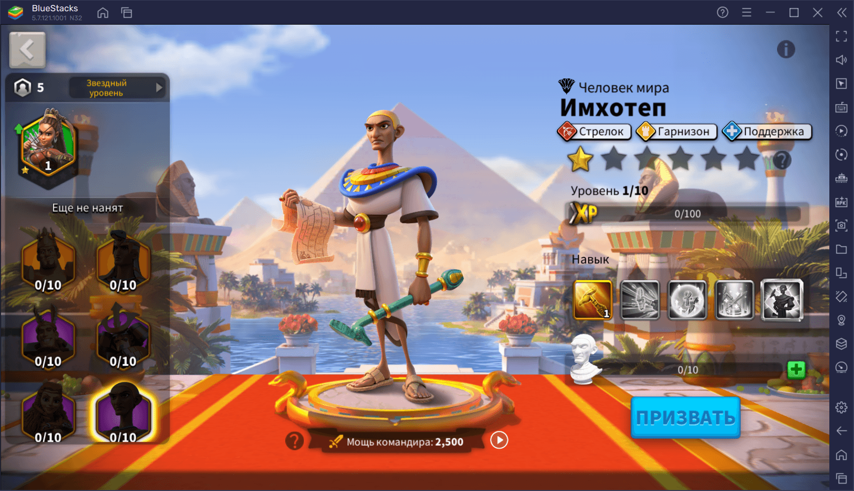Автор египетской медицины, создатель первой ступенчатой пирамиды — Имхотеп оставил большой след в истории Древнего Египта. Его навыки увеличивают характеристики лучников, а также позволяют ослабить врага и снизить ярость командира противников.