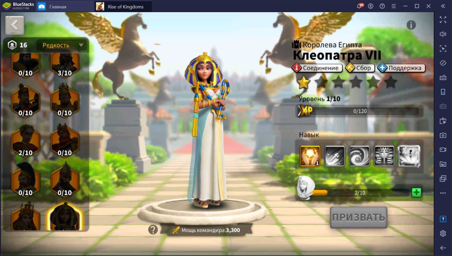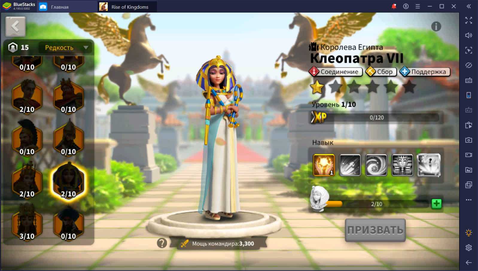 Клеопатра VII мастерски руководит процессом сбора ресурсов с карты. При прокачке второго навыка скорость добычи камня увеличивается на 30%, а остальных ресурсов — на 20%. Третий навык повышает максимальную нагрузку на войска от 10% до колоссальных 50%. Наконец, экспертное умение “Дары Нила” позволяет Клеопатре получать дополнительные наборы ресурсов за каждый успешный сбор. Открывайте золотые сундуки, чтобы заполучить эту героиню в свою команду или собрать ее скульптуры.