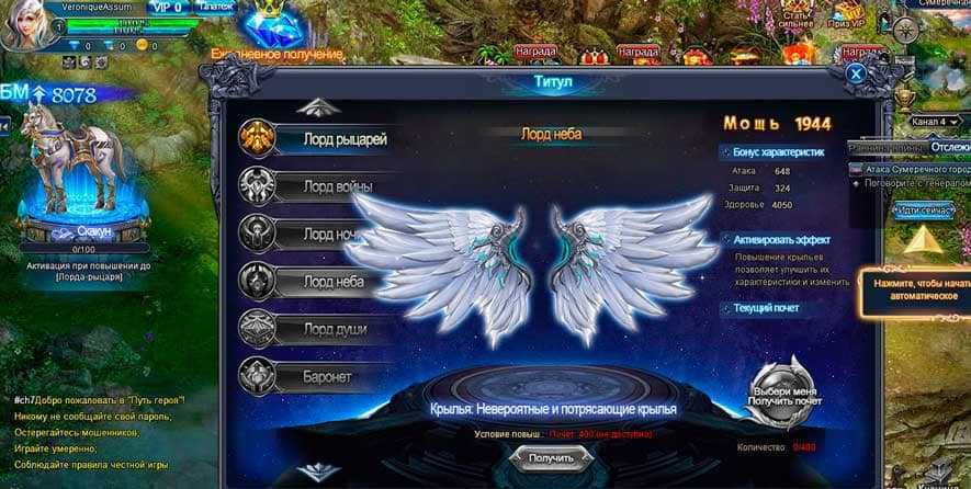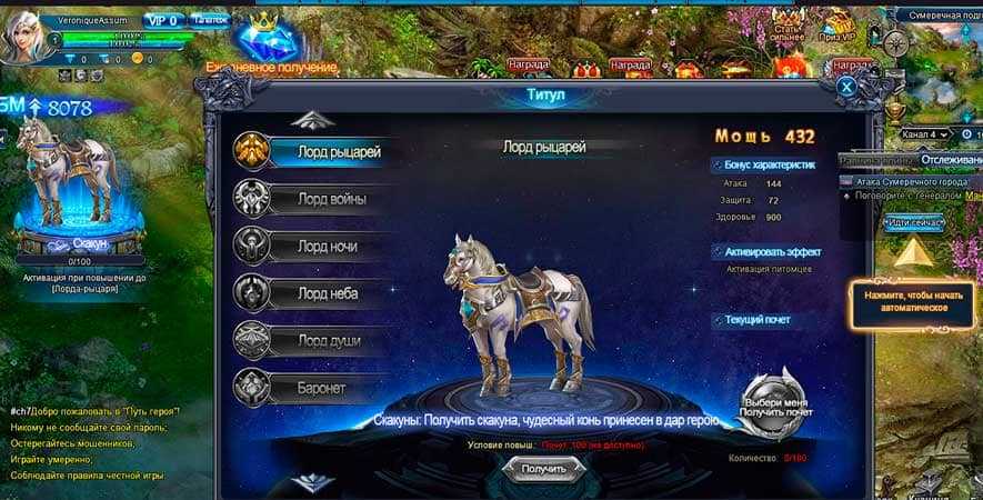 Онлайн игра Путь Героя это эпическая игровая механика, которая гасит по голове и сбивает с ног самых стойких своей простотой. Вам можно даже не участвовать в игре, вы можете не передвигаться по локациям и не драться самостоятельно. От вас потребуется распределение характеристик и навыков, а также самое главное это подбор подходящей амуниции, чтобы эффективно уничтожать мобов текущего уровня. Изначально вы появитесь не понятно где, NPC подскажет вам, как и куда нажимать, чтобы рубить врага. А также почти с первого уровня вы получите в использование гордого скакуна, чтобы быстрее преодолевать дальние дистанции. Ещё у вас на определённом уровне появится мистическое орудие в виде летающего питомца, словно третий меч. Скилл не важен, главное гнать, что есть мощи боевой рейтинг.