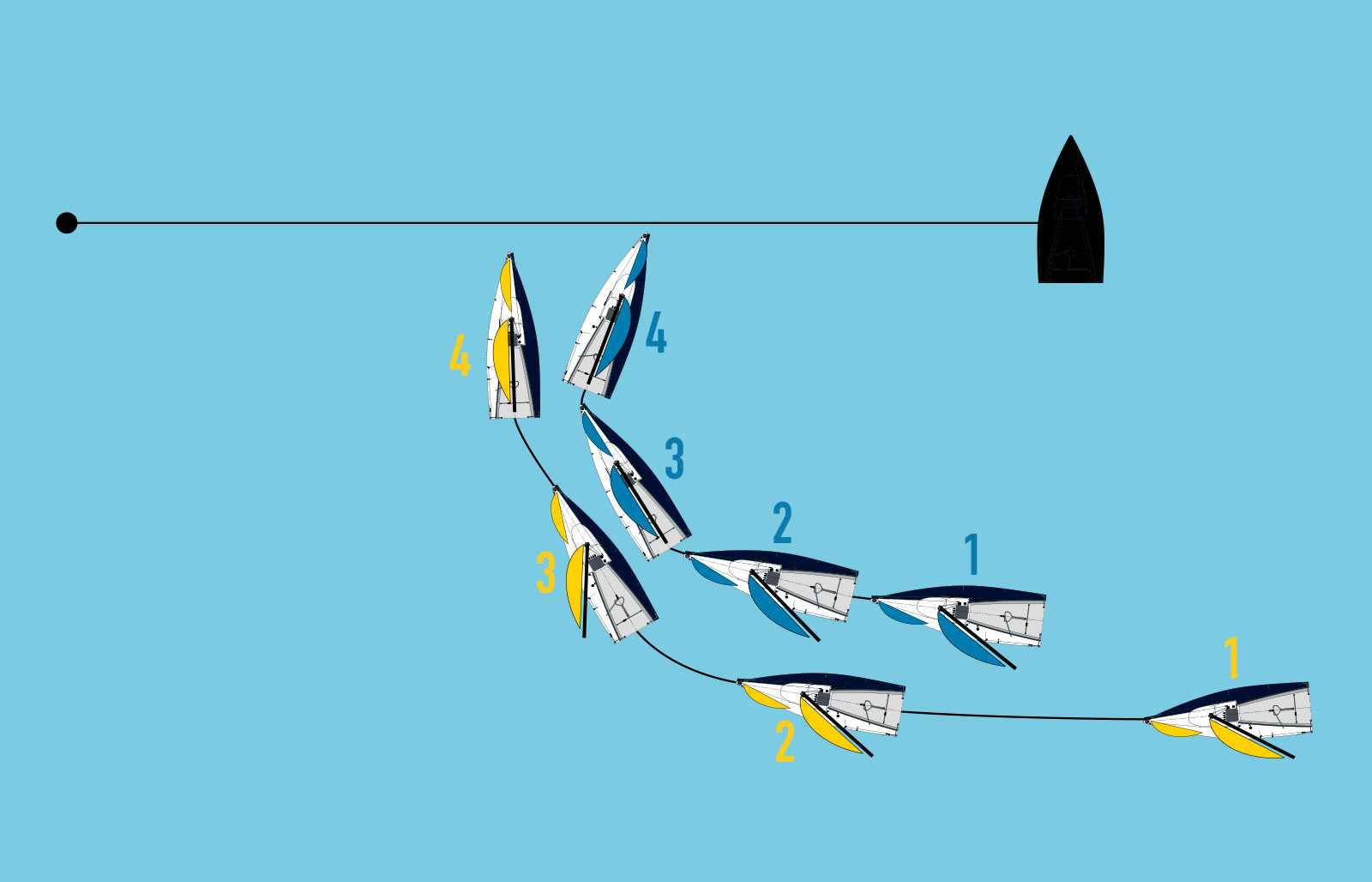 - Окажитесь связанными с противником с подветра, и заставьте его сделать поворот оверштаг на левый галс, затем сами сделайте поворот оверштаг и удерживайте его от лейлайна у судейского судна;