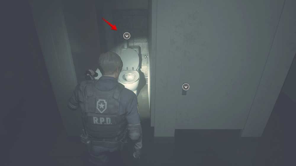Теперь снова возвращайтесь в коридор и посветите фонариком вправо, чтобы увидеть упавший металлический шкафчик. Его нужно отодвинуть, чтобы освободить проход в туалет. Когда окажетесь в туалете, посветите на сливной бачок унитаза. На нем стоит спрей для восстановления здоровья — забирайте. Затем повернитесь примерно на 90 градусов вправо и проходите в следующую дверь. Она ведет в раздевалку.