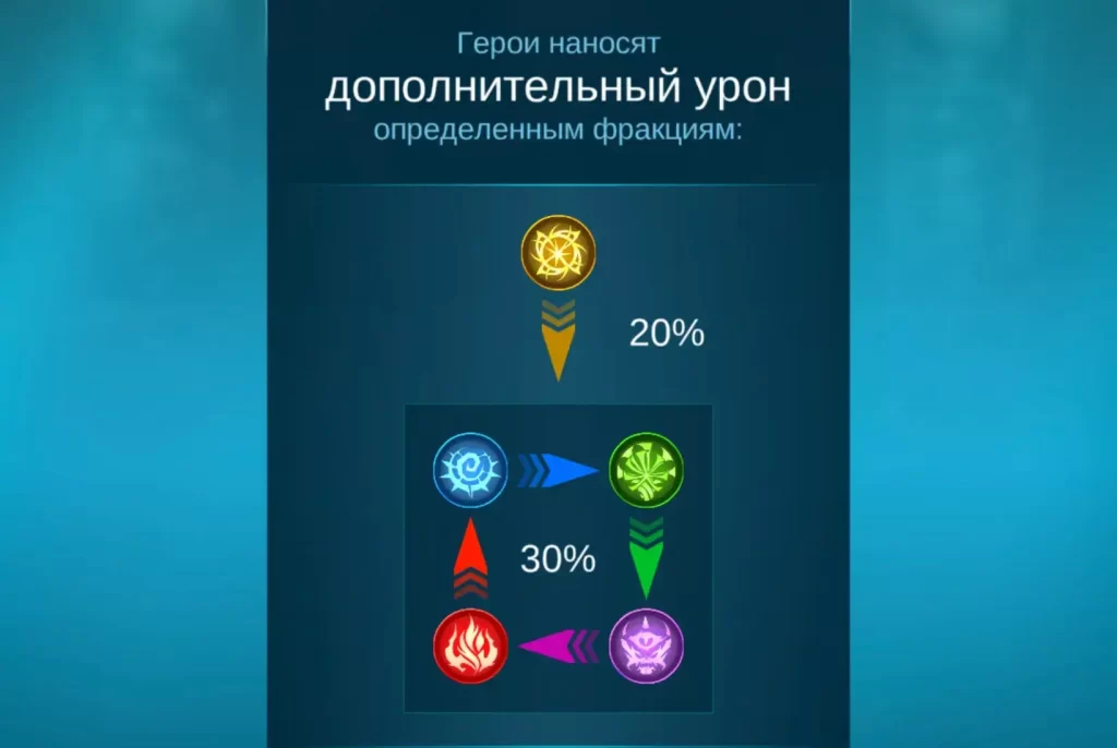 Достаточно запомнить простую картинку, которая наглядно демонстрирует описанное выше. Нежить при атаке пепельной фракции получает +30% к урону. Пепельная с таким же процентом бьет по альянсу. Альянс наносит дамаг лучше по хранителям, а хранители по нежите. Божественная фракция вынесена отдельна, так как бьет по всем фракциям с +20% уроном.