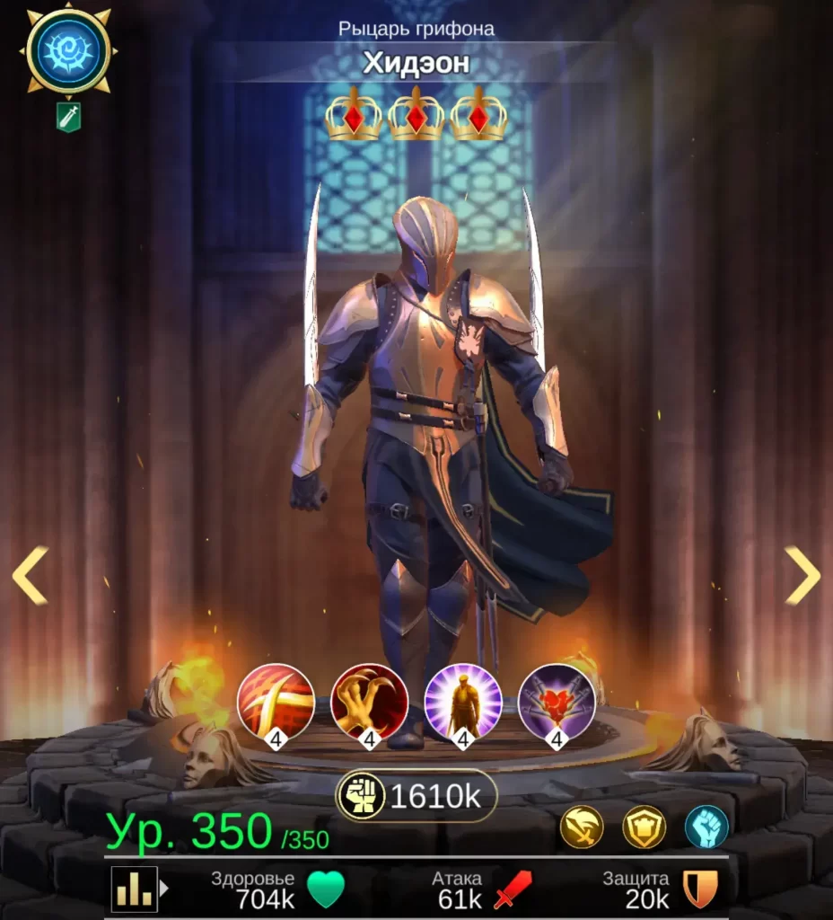 Хидэон прекрасно дополнит отряд с огромным количеством защиты. Он выстоит против сильнейших. Навыки ориентированы на большое нанесение атаки.