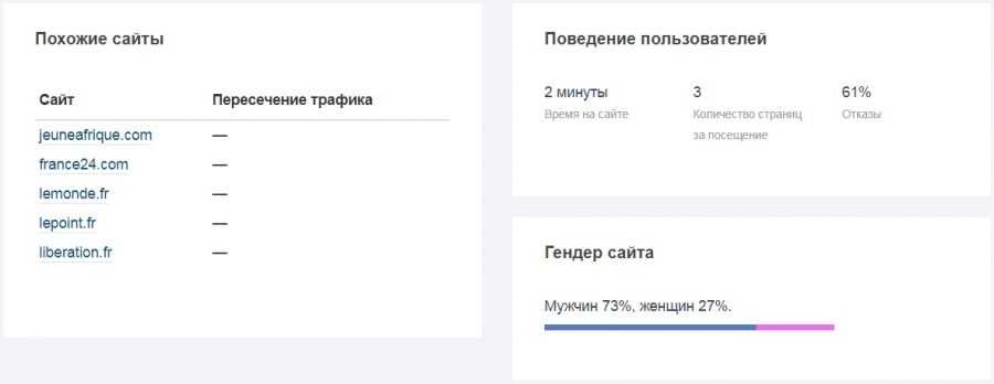 В бесплатной версии некоторые отчеты закрыты (процент географического распределения пользователей, переходы из социальных сетей, источники трафика), но самая важная статистика остается доступной. Кроме того, вы можете получить информацию о поведенческих факторах, гендерном соотношении аудитории и просмотреть сайты, похожие на анализируемый ресурс.![]()