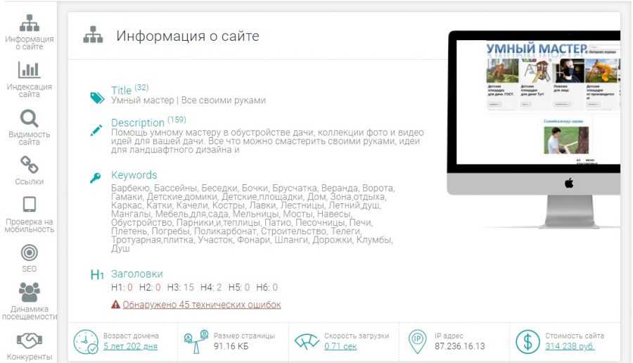 - Общие данные о сайте (скорость загрузки, whois домена и т.д.).