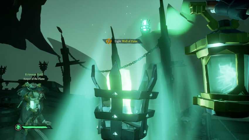 Идите к маяку, удерживая в руках Проклятого Капитана. Вскоре вы доберетесь до обветшалого моста. Если долго постоять у моста, земля начнет дрожать, и он восстановится. Это связано с присутствием Проклятого Капитана. Перейдите через мост и продолжайте подниматься к маяку. Вы поймете, что практически добрались до вершины, когда ступеньки станут каменными. Как только достигнете вершины, Проклятый Капитан попросит поместить его череп на туловище из костей. Безголовый скелет есть на вершине, с подзорной трубой в руке. Поднимитесь по лестнице на самую вершину маяка. Там будет жаровня. Подойдите к ней и увидите подсказку об использовании фонаря. Если хотите вызвать паромщика, придется настроить свет. По обе стороны от огня есть колесо. Одно колесо позволяет наклонять линзу маяка, а другое — ее вращать. Что нужно сделать? Вы целитесь в три ближайших маяка. Один есть на юго-западе. От него поверните влево и увидите еще два. Зажгите все три, чтобы открыть следующую награду, связанную с восстановлением утраченного света и вызовом спасателя. Вы также увидите Паром Проклятых.
