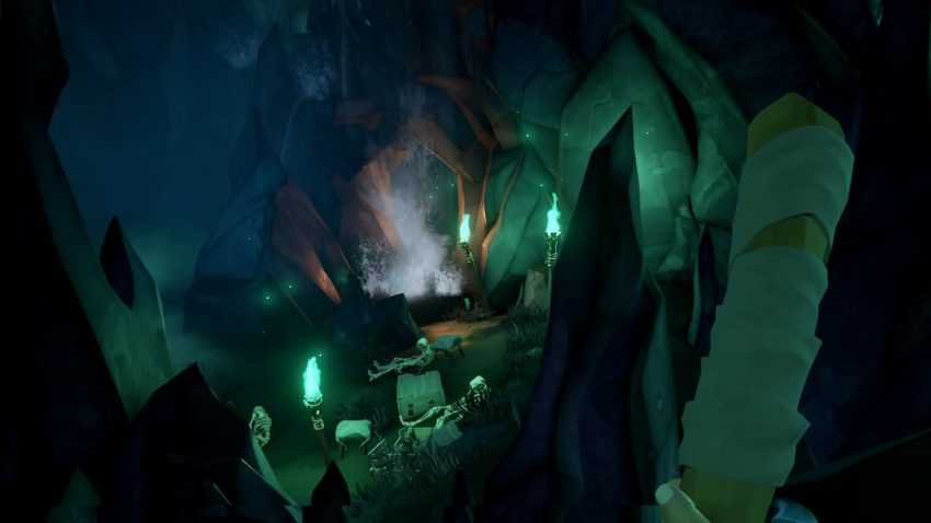 После просмотра сцен с призрачными пиратами в стиле Диснейленда вы подниметесь по спирали и доберетесь до запертой двери. Рядом с ним будет петля с сообщением «Требуется ручка». Если вы спуститесь вниз по склону и увидите водопад, пройдите через водопад и направо, чтобы найти неподвижный скелет, обнимающий ручку весла. Верните ручку весла к петле, чтобы починить сломанный дверной рычаг.