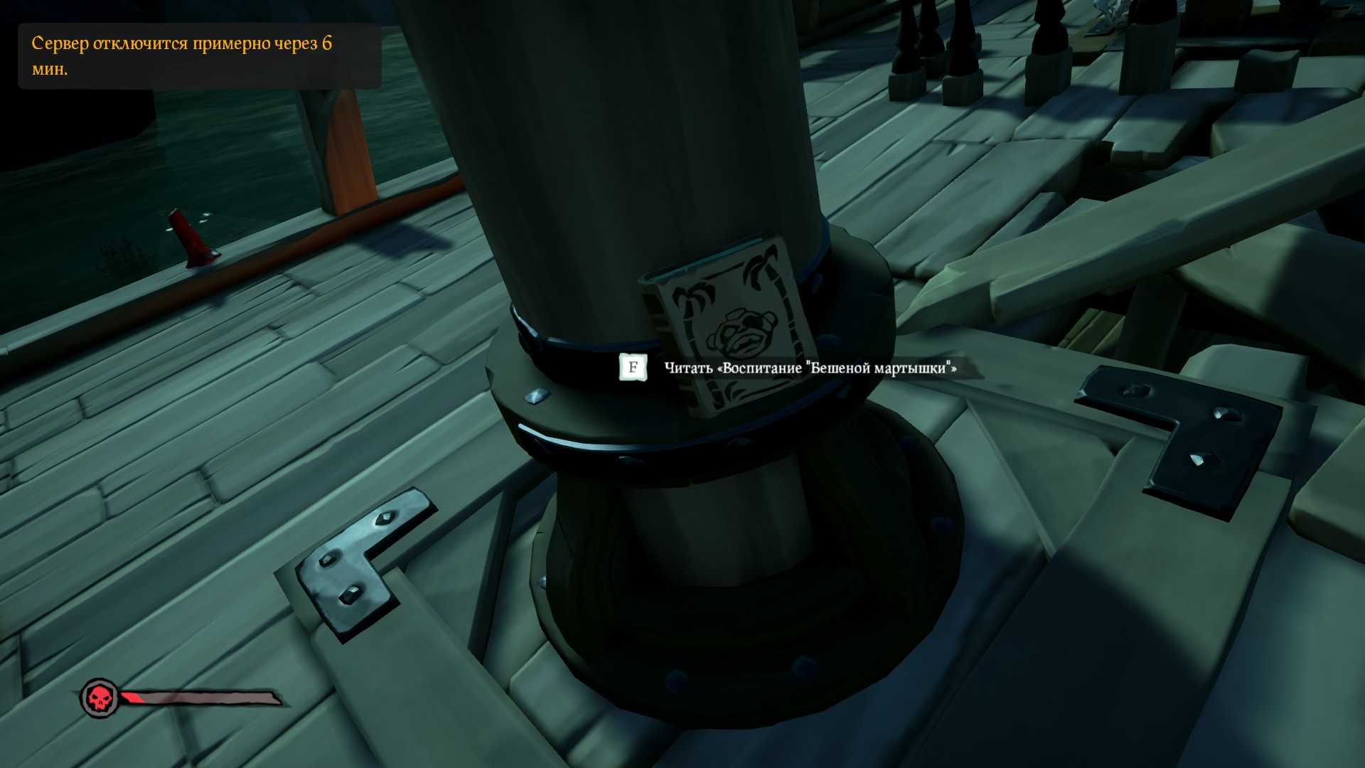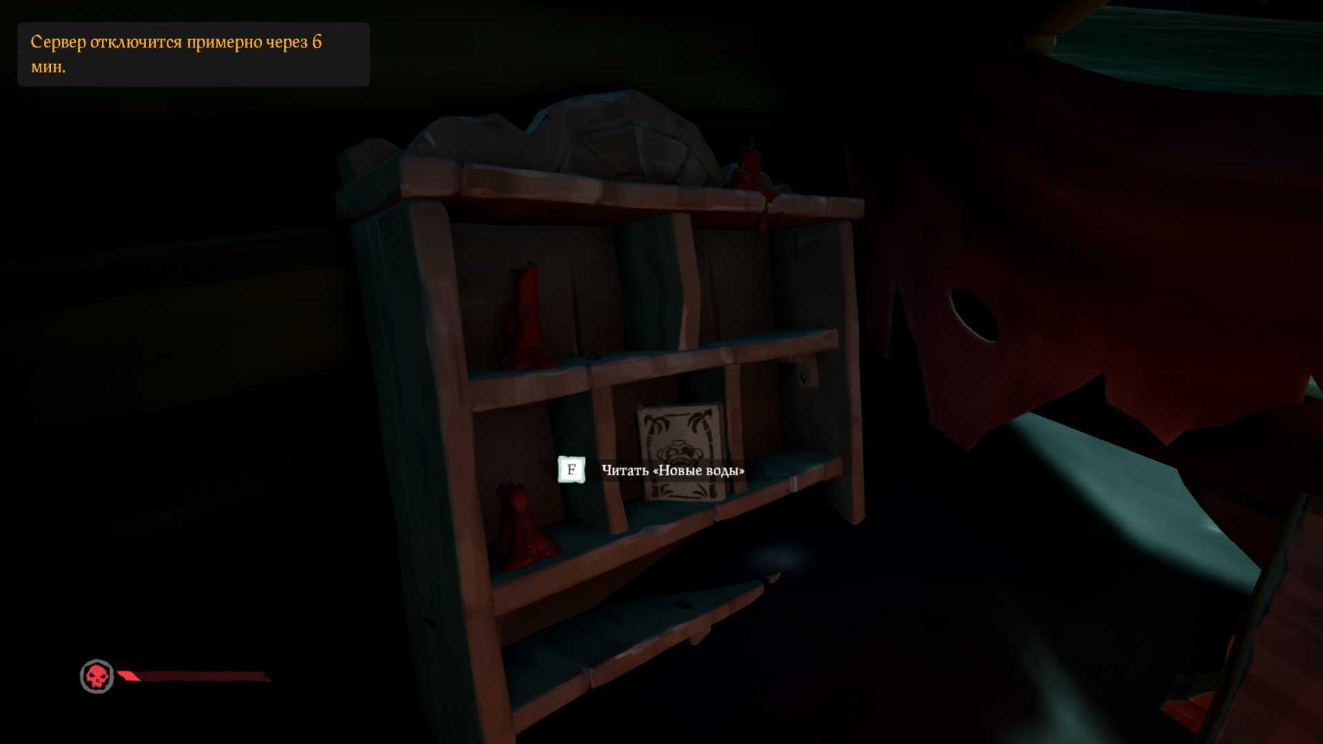 - Наконец, нужно посетить корабль Проклятого капитана, «Золотой заяц». Сделать это получится только после вызова паромщика. Принесите череп Проклятого капитана к месту крушения гигантского корабля на севере от маяка. Там будут красные паруса. Поместите череп на тело скелета за дверью на палубе корабля, чтобы попасть внутрь. Поднимитесь на корабль в каюту капитана и обыщите книжную полку справа.
