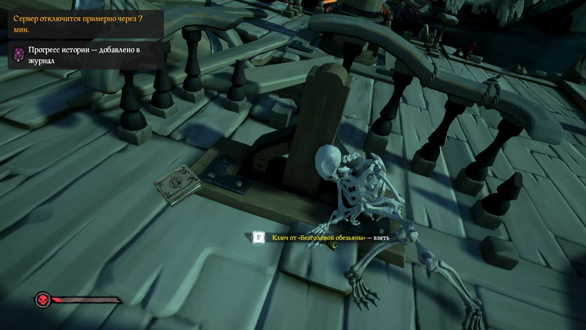 Далее используйте медальон Горемыки Даги для участия в игре. Поместите череп капитана на взорвавшийся скелет. Он сыграет в шахматы, выиграв для вас партию, и на столе появится ключ.