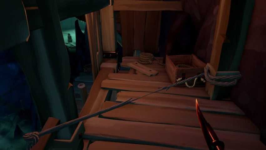 Скелет скажет вам отыскать сундук, который кто-то украл у него. Направляйтесь к разрушенному кораблю со скелетом в пижаме (судно разбито пополам, но удерживается мачтой). В помещении с трупом отыщите шкив, открывающий шторки над кроватью.