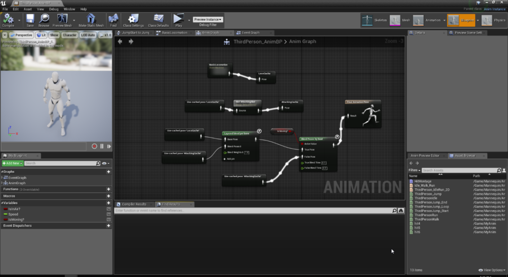 Анимация. Персонаж любой современной игры подвижен и гибок, умеет бегать и прыгать. Все это возможно благодаря анимированию. В UE начинающие разработчики могут импортировать уже готовые мэши со скелетами персонажей и настройки анимации. Неопытных пользователей, которые желают познакомиться с ПО поближе, приятно удивит Animation Blueprint — скрипт, который значительно упрощает работу по созданию паттернов движений персонажа без использования кодинга.