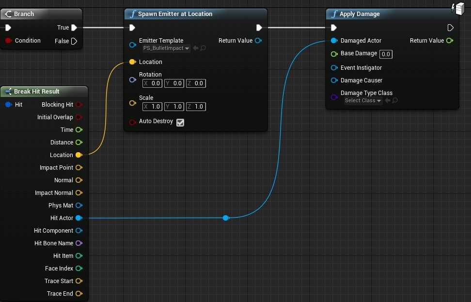 Теперь нужно указать, какому объекту будет наносится урон. Для этого соедините Damaged Actor с Hit Actor узла Break Hit Result: