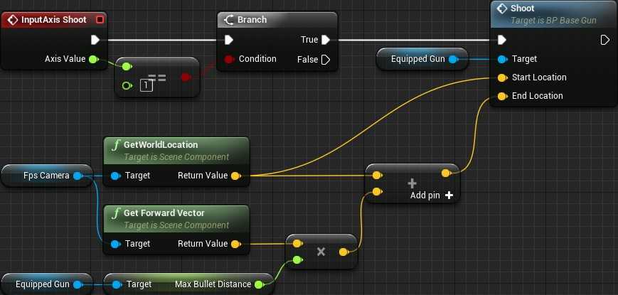 Теперь вам нужно указать конечное местоположение. Помните, что у оружия есть переменная MaxBulletDistance, в которой используются единицы для указания местоположения. Вам нужно создать выделенные на изображении узлы: