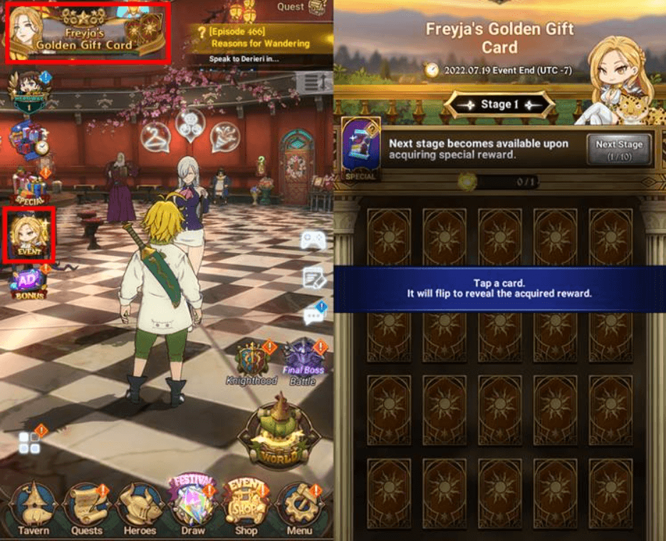 Freyja’s Golden Gift card event states that players will be able to earn some juicy rewards just by participating in the event and flipping cards. The entire event starts on 5th July 2022 after the update is implemented and ends on 19th July 2022. The event is divided into different stages and each stage of the event has 20 cards that are upside down. The new event also features a new event currency called “Captivating Energy” which is used for flipping cards and reaping the rewards. Each stage contains 19 normal rewards and 1 special reward. Once the player gets the special reward of the stage, they will be able to move on to the next stage or stay on the current stage to get the remaining rewards. Captivating Energy can be farmed from the different locations in the game like Main story stages, fort solgres, boss battles, deathmatch, knighthood boss battle, reverse stage, Training grotto stages, and Tower of Trials floors. Players can also get the Captivating Energy event currency through the Coin Shop.