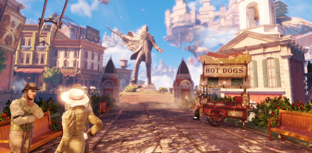 Зато в Infinite создатели сменили мрачные тона на более светлые и отправили игроков в небесный город Колумбия. Место получилось не менее впечатляющим и притягательным. В нем нет и толики мрака, ведь даже малейшие тени разгоняет солнечный свет. Но при этом даже в столь светлом городе творятся темные дела, в которых игроки разбирались, наслаждаясь прогулкой по улицам Колумбии.