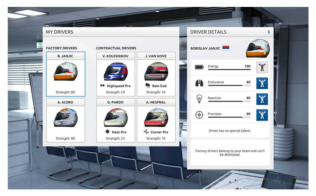 - Пилоты. Тренировки, тренировки, и ещё раз тренировки! Разработайте для них как можно более эффективный план, чтобы выжать из гонщика максимум результативности! Заключайте контракты с лучшими, и продавайте «лузеров».