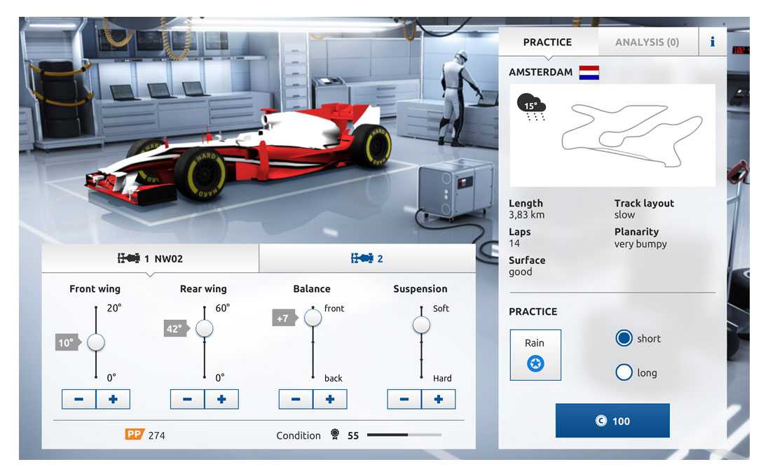 Почему в теории? Потому что другие игроки в UnitedGP, так же как и вы, перед каждой гонкой крутят и вертят свои болиды в попытках найти идеальные настройки с учетом состояния трассы и погодных условий. Решает тут опыт, ну и техническое состояние всех систем, которые, к слову, имеют свойство изнашиваться. Новые элементы болида стоят кучу денег, поэтому придется еще и возиться со спонсорами. Наиболее успешных ждут победы в гонках, переход в следующую лигу, ну и, конечно, новые инженерные примочки, коих в игре насчитывается несколько сотен, начиная с таких очевидных вещей, как более мощные двигатели, и заканчивая всякими мелочами, вроде энергоемкого руля.