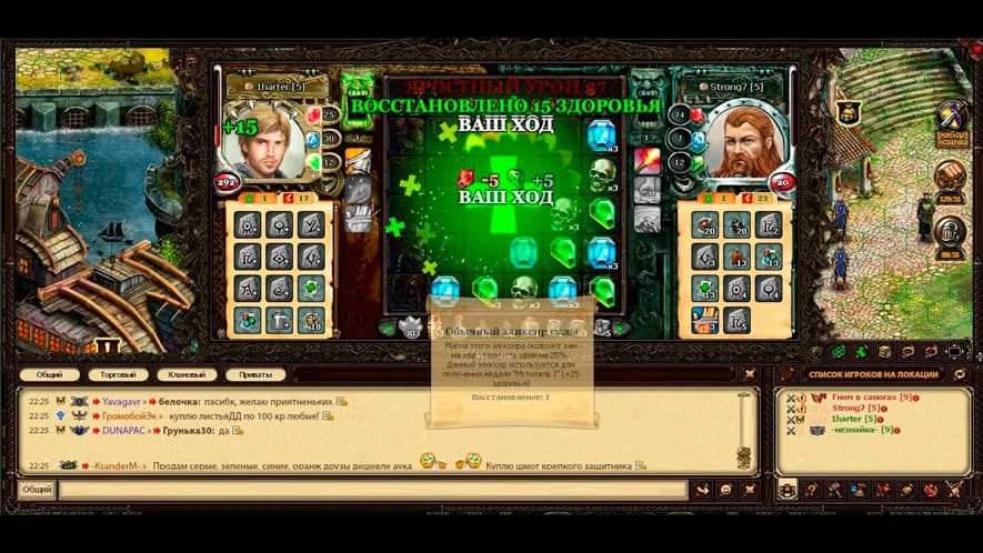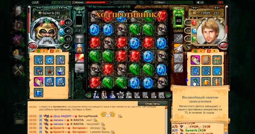 Бои в игре Техномагия перевернут ваше представление о жанре, разработчики реально использовали всю свою креативность, и создали уникальную систему поединков, которой до сих пор нет аналогов среди браузерок. Да, есть пошаговые действия, можно использовать стандартные тактические приёмы, но бой представляет собой мини-игру, словно какой-то тетрис с разноцветными кристаллами и черепами. Чтобы атаковать противника на игровом поле нужно собрать последовательность минимум из трёх одинаковых кристаллов. Битва даже при таком раскладе получается динамической, максимум на раздумье у вас не более тридцати секунд.
