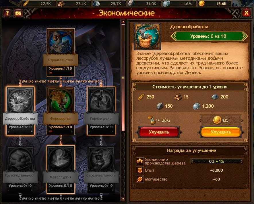 Сердце империи — это замок. Вы должны строить, улучшать здания, проводить исследования, торговать и набирать войска. Любое строительство отнимает время, но до 5 минут на таймере работает ускорение. Новички могут быстро прокачать строения. В поздней игре на стройку уходит до двух часов. Приходится аккуратно выбирать цель для траты ресурсов: еды, дерева, золота и кристаллов.