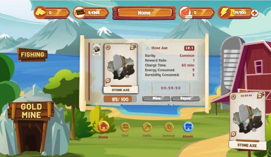 - Горное дело. Благодаря горнодобывающей деятельности фермеры способны выращивать NFT и золото. Полученное дерево и золото можно использовать, чтобы создать инструменты, либо отремонтировать оборудование. Также можно ловить рыбу, чтобы пополнять раздел «Еда» и максимально увеличивать свою силу.