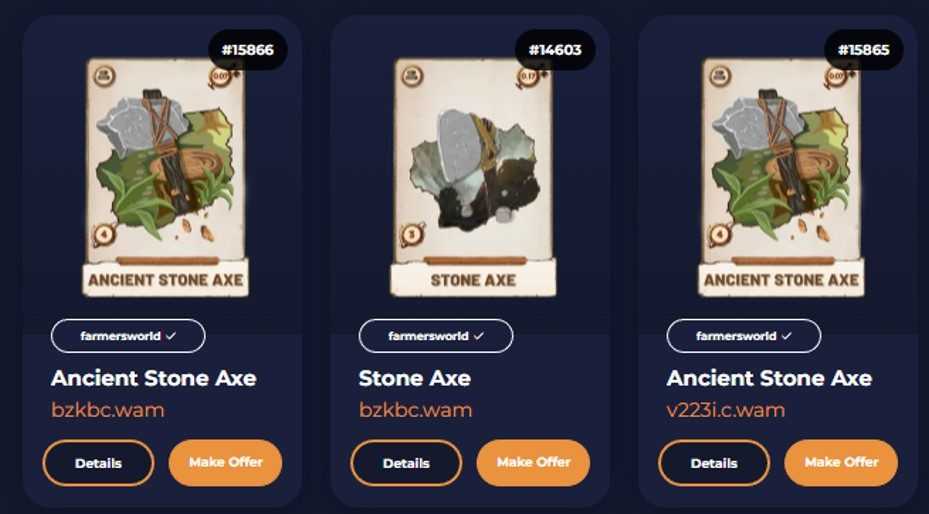 Прокрутив страничку ниже, вы увидите большой список NFT от данного проекта. Начать можно с топора для добычи древесины. Называется он Stone Axe, курсы сейчас просели, поэтому много денег на это не потребуется (раньше игрокам приходилось тратить сотни долларов):