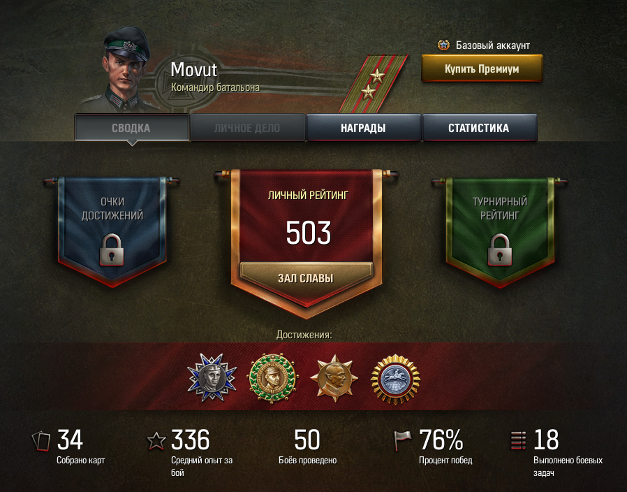 Итого, из 50 боёв в самом начале я проиграл штук 5 по неопытности, играя за СССР, 2 раза меня убил сильный немец, 2 раза – американец и 5 раз я проиграл из-за того, что забывал взять в игру снаряжение, начиная с неподходящей рукой. Можно, конечно, ещё 50 отыграть, подняв процент до 80, но кому это нужно.