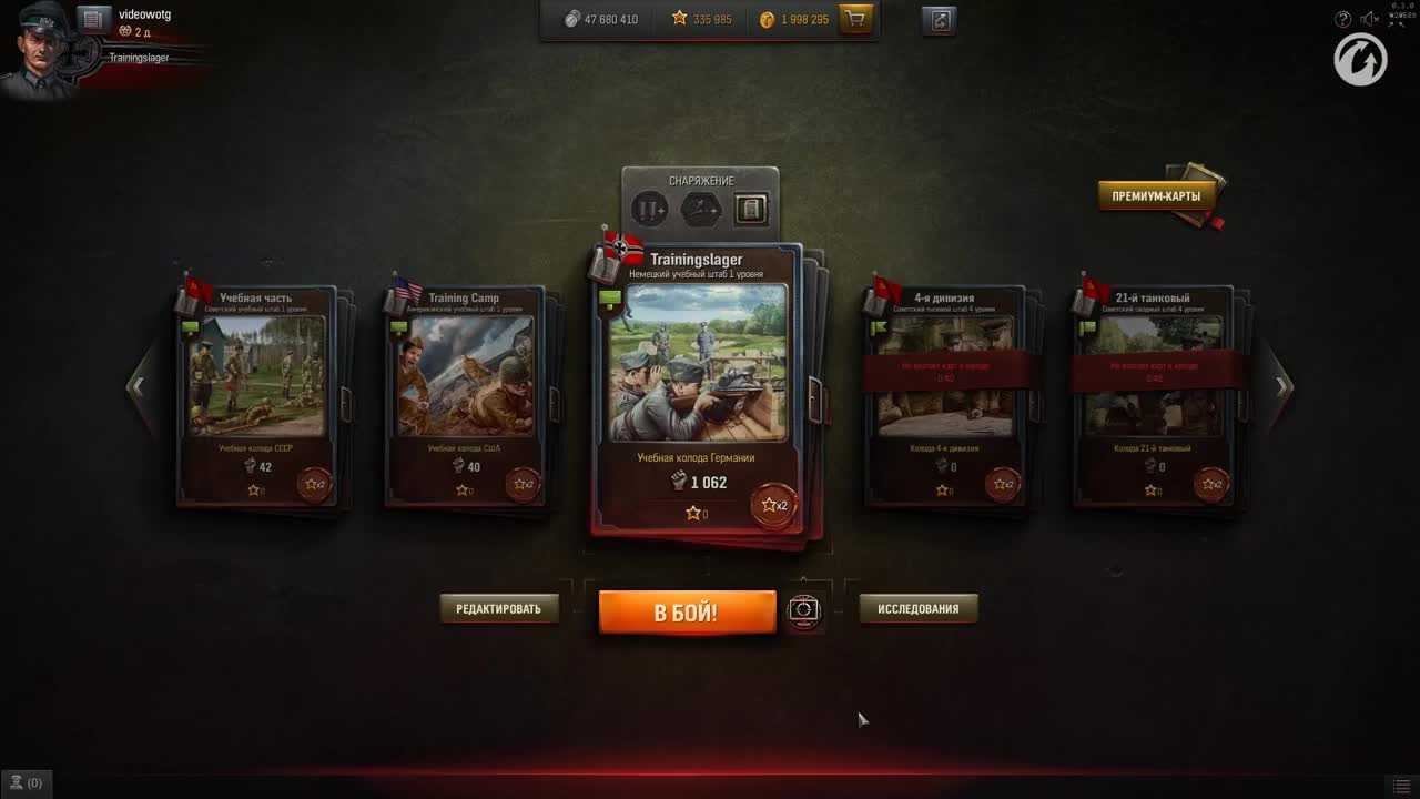 В распоряжении игрока 4 вида карт: карты СССР, Германии, США и учебные. Все они разделены на 10 уровней, по аналогии с танками. У каждой свои уникальные умения и характеристики. Также карты разделены на взводы: защитные и атакующие. Как и в Мире Танков, здесь присутствуют классы техники. Если вы играли в WoT, то разобраться какая карта, что делает, не составит особого труда. Чтобы пойти в бой, необходимо заранее собрать свою колоду.